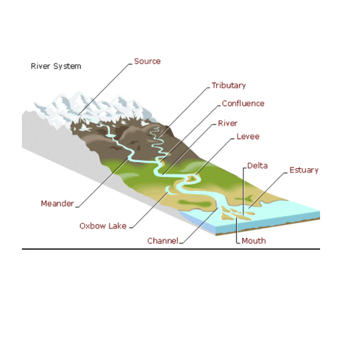 Shows realistic illustration of lateral stream erosion and weathering. Underlying layers are shown in cross section.