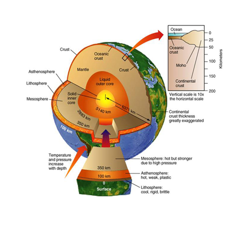 Showing the layers inside the Earth with 7 detachable parts showing the interiors of Earth. Different colours for different layers. When upper crust is removed, inner core with layers can be seen. When layers one by one are removed you can find the periphery of each layer.
