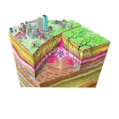 Showing the origin, motion produced and the effects of earth quakes. Various types of seismic waves are also shown, size 75x100 cms.