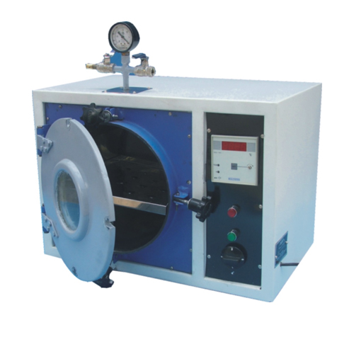 Double walled construction. Inner round chamber made out of stainless steel, exterior made out of mild steel duly finished in white stoving enamel/powder coated paint with mat finished colour combinations. Temperature range 50oC to 130o, 3oC. The body capable of with standing vacuum of 760 mm hg. Workable on 220V AC 50 Hz single phase. Supplied without Vacuum pump.