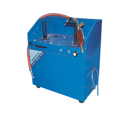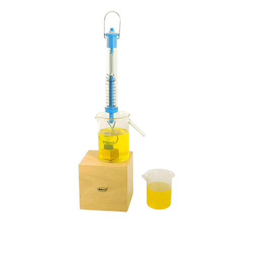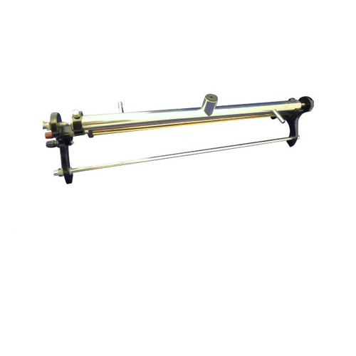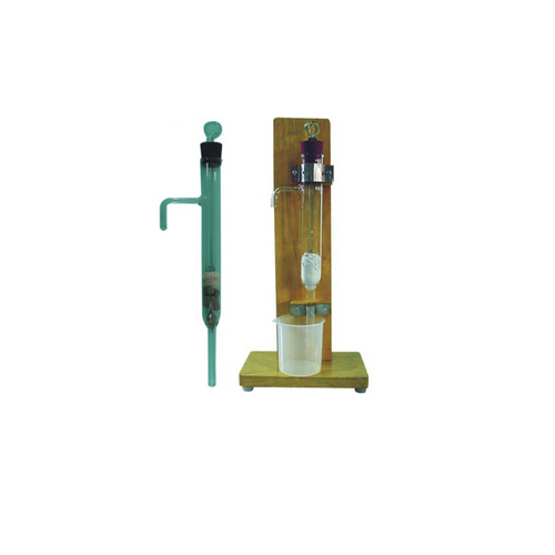 With a glass U tube with a bulb and tap at the upper end of one limb and other limb open. From the bottom of the ‘U’ is an outlet tube which passes through a bung and terminates in a tap. The stem below the bulb is graduated 3 x 0.1 ml, an inlet tube with Mohr clip also passes through the bung. The glass water jacket encloses the U tube. All glass parts made of borosilicate glass required only 20 ml mercury. Without mercury.