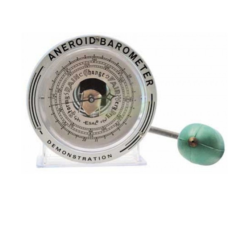 With 100mm dia l graduated 28 to 31 inch of mercury and 960 to 1060 millibars. With plated bezel, cover glass and index plastic base approx. 16cm diameter. Enclosed in a transparent synthetic case for demonstration purposes. Air tight sealed all round, a pressure bulb is provided to force the movements for educative demonstration.