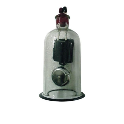 For use on pump plate not less than 15 cm. dia. Electric Bell operating 4-6 volts AC/DC, suspended on rubber cord in bell jar. Fine coiled wire connections to terminals mounted in rubber bung sealing the jar. Sizes : 9 and 8
