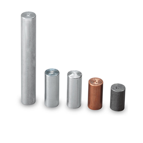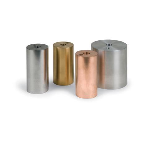 Metal, for experimental determination of specific heat of different metals, cylindrical metal blocks 1 kg ± 2%. Each block has a central hole for a special immersion heater and a smaller hole for thermometer.