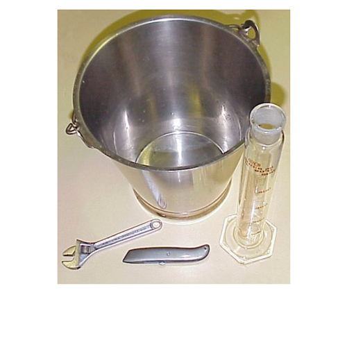 To demonstrate the principle of Archimedes. Brass, bucket with suspension loop at top and a hook at bottom, with the cylinder having a suspension hook at top. Cylinder is 50 x 16 mm dia, overall length including hook and suspension loop is 110 mm approx.