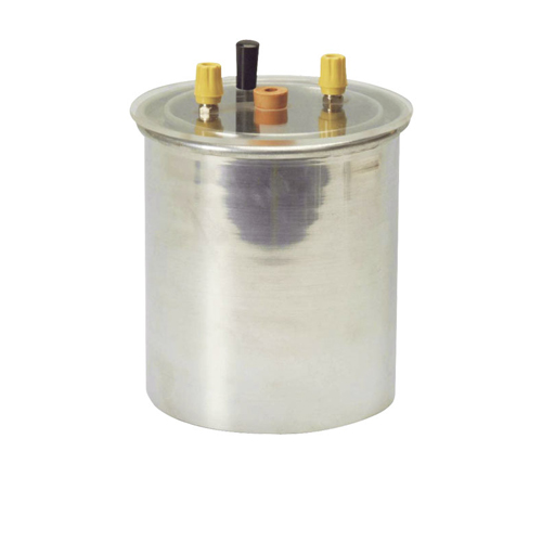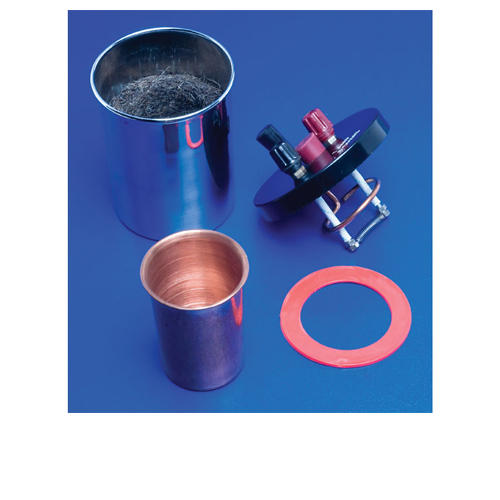 Copper calorimeter of size 63 x 63 mm enclosed in an outer vessel of 80 x 90 mm size, with lid having terminals, a heating coil suitable for 3-6 V supply and holes for thermometer and stirrer, nickel plated. With stirrer but without thermometer.