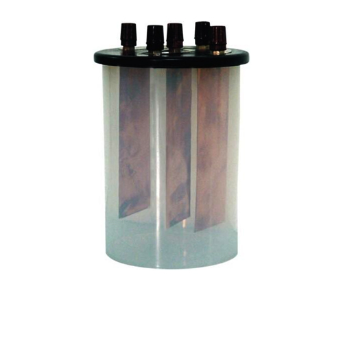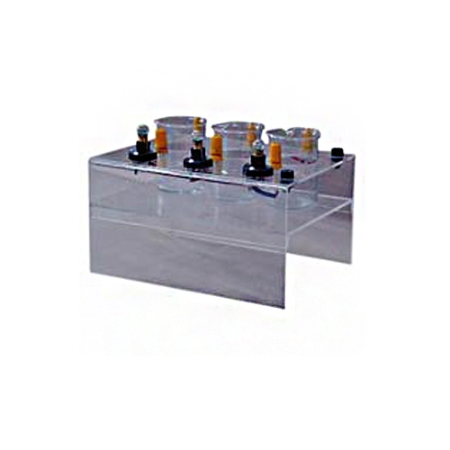 The apparatus consists of a fabricated transparent acrylic stand supporting three cells in the form of 50 ml glass beakers. Electrodes are suspended into the cells, each having a low voltage lamp in series to indicate the current flowing. The three cells and lamps, as a group are connected in parallel and provided with a pair of 4 mm sockets for connection to the external supply. The lamps provided will allow operation on a supply of up to 12V D.C.