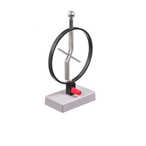 This rugged, sensitive electroscope can accept various accessories to change its capacitance. A sensitive aluminium vane is balanced in a vertical position on a metal support which is insulated from its base. The vane is easily observed and projected on a chalkboard (Light Source, not included) on which an arbitrary scale has been marked. Height without attachments is about 9". Four attachment, each equipped with a banana plug which fits the vane system top, are included : a 1" conducting sphere; a 3" conducting sphere; a proof plane with detachable insulating handle; and an aluminium cup (Faraday ice pail). Attachments can be charged using either our Electrophorus or our Power Supply (not included) with instructions.